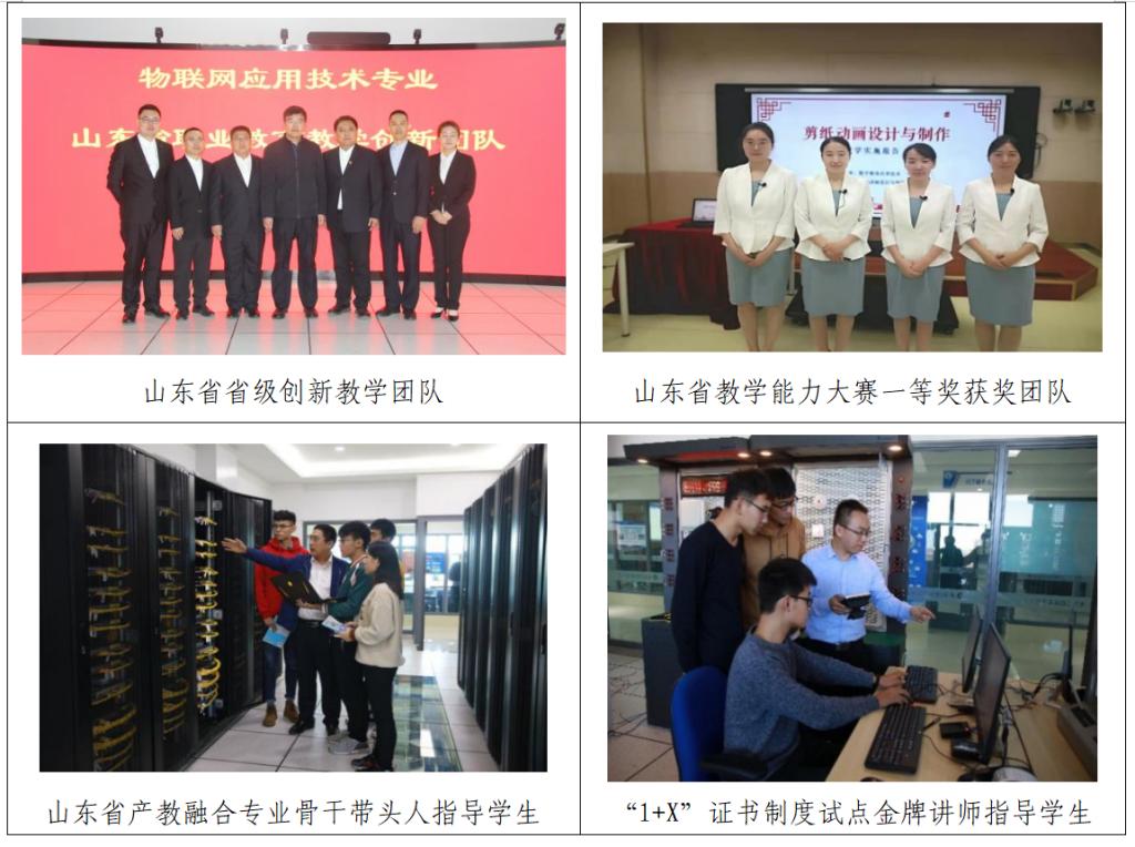 学院拥有山东省名师工作室1个,山东省省级创新教学团队1个,山东省教学名师1名,山东省技术能手3人,山东省青年技能名师1名,山东省产教融合专业骨干带头人1人;山东省青年教师教学比赛一等奖教师2名,山东省教师教学能力大赛一等奖团队1个,全国微课大赛一等奖教师2名;教育部信息化教学指导委员会1人,山东省职业教育计算机类专业建设指导委员会2人,潍坊市专业技术拔尖人才1人,教育部“1+X”证书制度试点金牌讲师1人;6名教师被确定为全国、省信息化大赛、职业院校技能大赛专家评委,1人获得“全国职业院校技能大赛先进工作者”,8名老师获得全国职业院校技能大赛优秀指导教师,7名教师正在攻读博士学位。