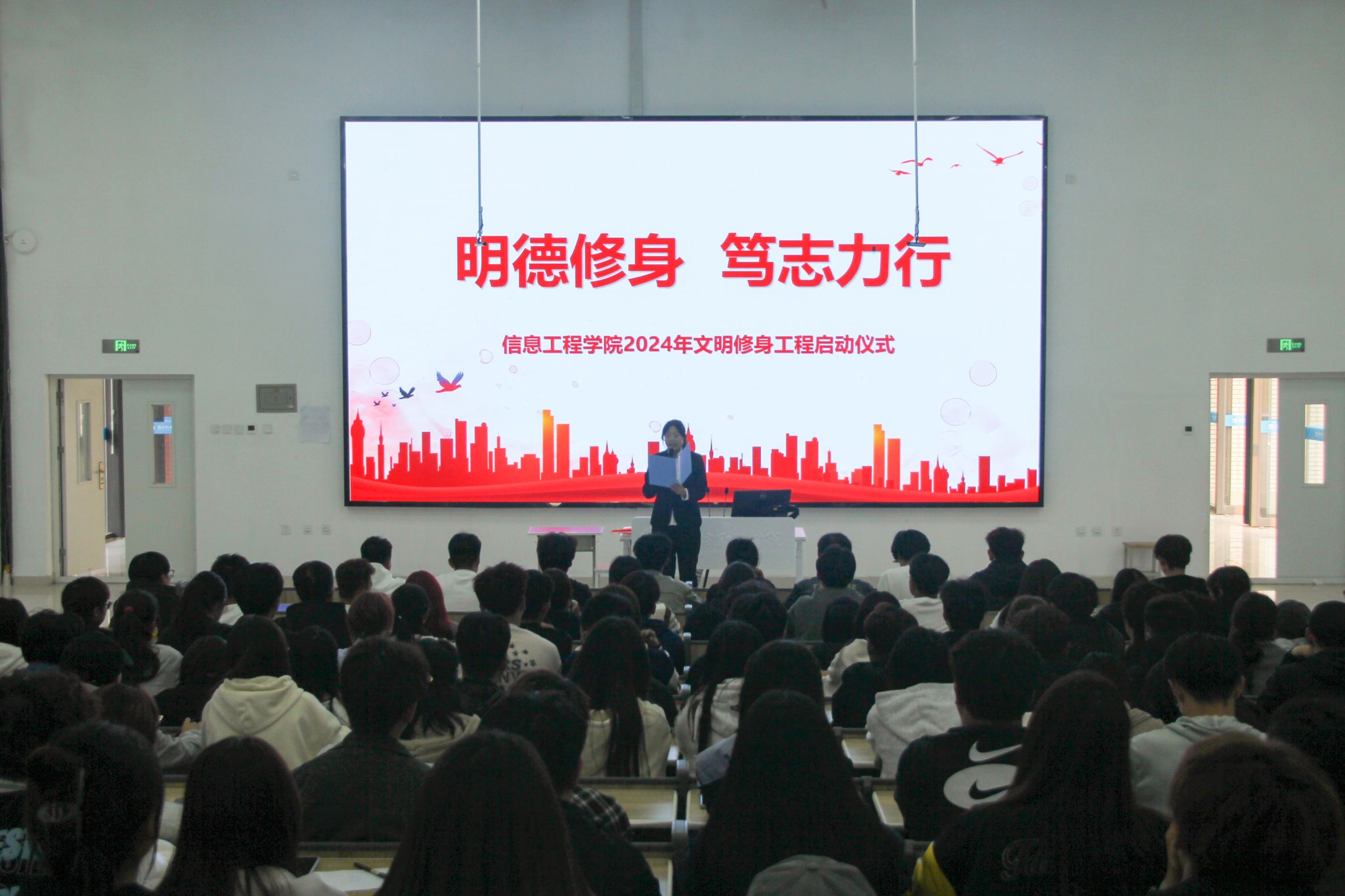 为深入贯彻习近平新时代中国特色社会主义思想和党的二十大及二十届三中全会精神,提升学生文明素养,推进校园文明建设,信息工程学院于10月16日下午举办了“明德修身,笃志力行”大学生文明修身工程启动仪式。