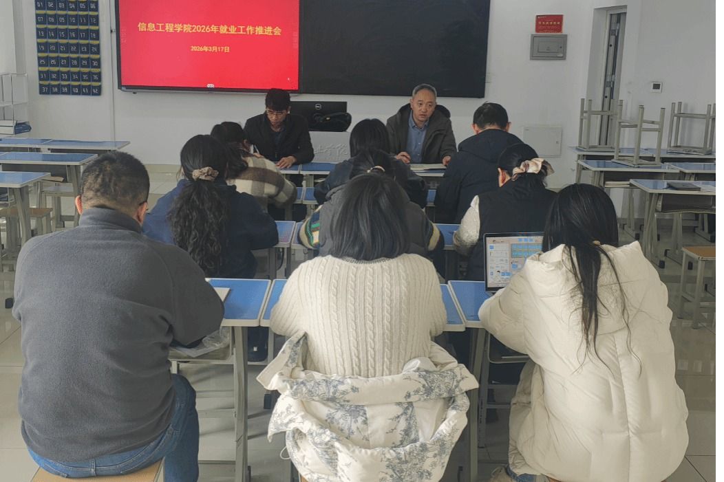 为贯彻落实上级关于高校毕业生就业工作的安排部署,全力促进毕业生更充分更高质量就业,3月17日,信息工程学院组织召开2026届毕业生就业工作推进会议,信息工程学院党总支负责同志、分管学生工作负责人及2026届毕业班全体辅导员参加会议。会上,信息工程学院党总支负责同志传达了学院2026届毕业生就业工作会议精神,分析了目前2026届毕业生面临的就业挑战,并结合当前国家有关就业政策和要求,就当前毕业生就业工作提出四点要求:一是要提高政治站位,增强做好就业工作的使命感、责任感,深刻理解毕业生就业工作的重要性,立足学院事业发展大局,强化措施千方百计助力毕业生充分高质量就业;二是要统筹规划、提前部署,抢抓春季开学后促就业工作关键期,加快摸底了解毕业生就业状态,进一步鼓励引导毕业生树立先就业后择业的正确就业观;三是要深化产教融合,持续深入开展访企拓岗,主动对接行业龙头和优质企业,不断拓宽毕业生就业渠道。四是要加强对2026届毕业生的就业精准指导和分类帮扶,切实关心、关爱并努力帮助未落实就业单位毕业生尽快走上工作岗位。信息工程学院分管学生工作负责人对学院下一步就业工作提出具体要求并作出具体安排,相关老师讲解了2026届毕业生就业登记工作流程,并对各类型就业材料的标准、规范和就业平台材料上传要求等进行了详细解读。下一步,信息工程学院将紧紧围绕学院2026年就业工作主线,持续优化就业指导服务体系,全力助力2026届毕业生更充分更高质量就业。(李孟阳供稿)