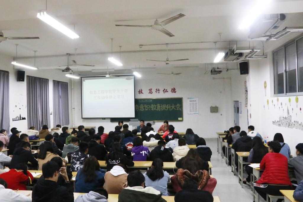 为强化学生干部服务意识,规范学生干部行为。11月13日下午,信息工程学院在惠泽2号楼B512多媒体教室召开学生干部服务意识教育提升培训大会,信息工程学院学生会主要学生干部及各班班长团支书参加了培训活动。