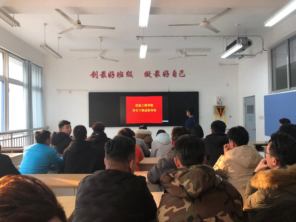 述职前,各学生干部按照考核要求准备述职PPT,对学生管理常规工作、活动组织开展、工作成绩等方面进行述职。述职过程中,学生会各部门负责人、各班班长分别就本学期部门、班级工作开展情况进行了汇报。一方面围绕本学期重点工作内容进行阐述,突出了工作亮点、工作创新点和工作成绩并自我分析了工作中存在的不足,明确了下一步的工作计划和任务;另一方面在学生干部汇报结束后,考评老师结合工作实际和述职情况进行点评,明确指出前期工作开展中的优点、不足和后期工作开展的注意事项。最后,信息工程学院学生管理负责人对本学期以来学生干部工作表示肯定,要求学生干部加强学习和交流,掌握工作技巧,提升工作效率与工作水平,创造性地做好学生工作。