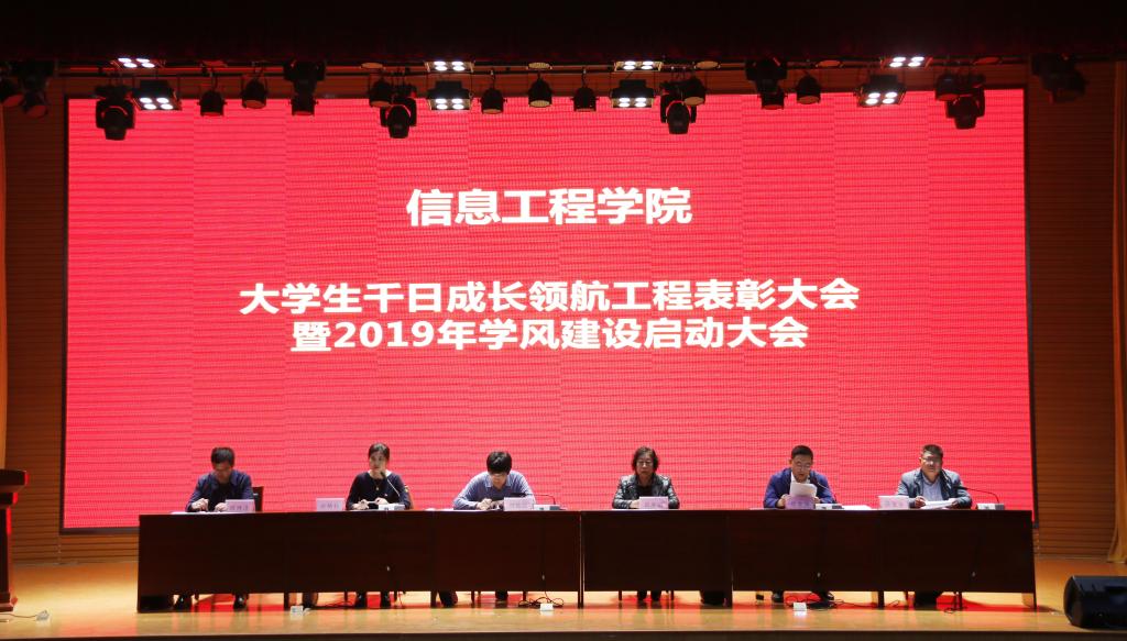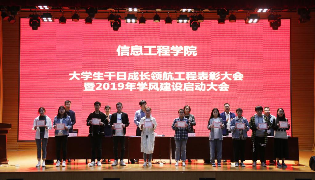 为表彰先进,选树典型,促进优良学风建设,4月15日下午,信息工程学院在图书馆报告厅举行大学生千日成长领航工程表彰大会暨2019年学风建设启动大会,信息工程学院负责人、全体辅导员(班主任)以及500名学生参加了本次大会。