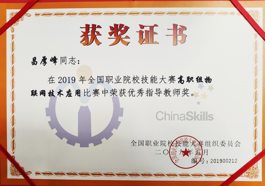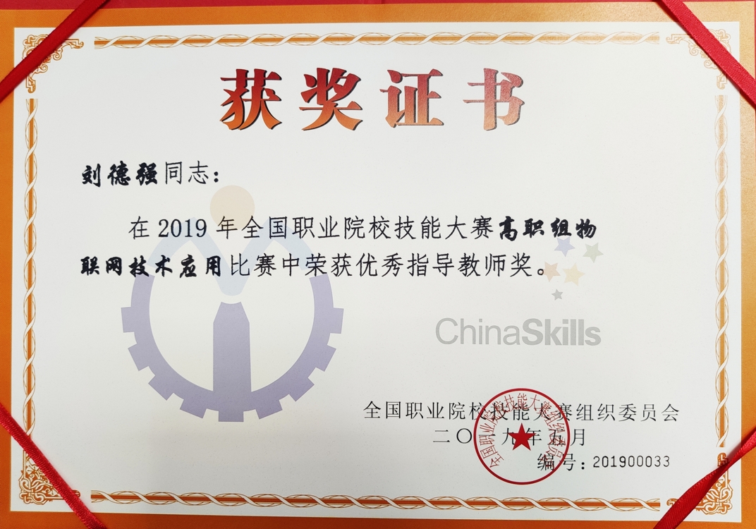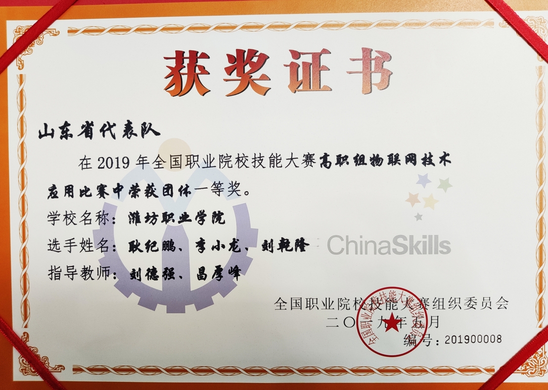 5月7日,2019年全国职业院校技能大赛高职组“物联网应用技术”赛项在天津中德应用技术大学举办,来自全国104个代表队参加角逐。我院学生耿纪鹏、李小龙、刘乾隆组成的代表队,在指导教师团队刘德强、昌厚峰、焦国栋带领下以第一名的优异成绩获得团体一等奖,指导教师刘德强、昌厚峰获“优秀指导教师奖”。
