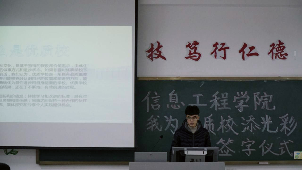 为助力学院优质高职院校建设,培养学生爱校情怀,激发学生兴校、荣校热情,增强学生凝聚力和主人翁意识,营造良好的学习生活氛围,信息工程学院于12月19日组织各班级开展“我为优质校添光彩”主题团日。