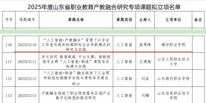 近日,山东省职业教育和产业人才研究院公布了2025年度山东省职业教育产教融合研究专项课题的遴选结果,我院主持的《“人工智能+产教融合”背景下以专业工作室为载体的高职校企合作新模式的研究与实践》课题成功获批立项。
