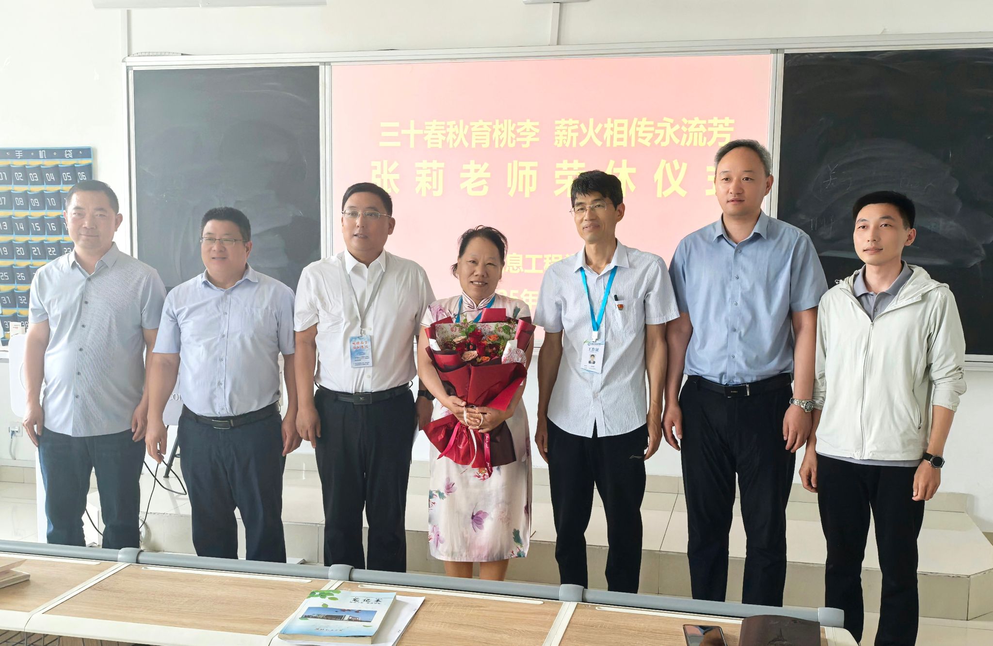 为进一步弘扬尊师重教传统,增强教师职业荣誉感,5月29日下午,信息工程学院为从教30年的张莉老师举办“三十春秋育桃李 薪火相传永流芳”荣休仪式。张莉老师深情回顾了自己30年的从教历程,分享了自己在教学育人、班级管理等方面的心得体会。张莉老师从教30年来,始终坚守育人一线,在数学教学、班级管理、学生服务等方面作出了突出贡献,培养了大批优秀人才。她提及自己担任班主任24年来的点点滴滴,言语间尽是对教育事业的不舍之情和对青年教师的殷切期望。她寄语青年教师要永葆教育初心,用爱心和耐心浇灌学子成长,助力学生练就过硬技能、成为社会栋梁。信息工程学院党总支负责人代表全院师生向张莉老师敬献鲜花,表达了最衷心的感谢和诚挚的祝福。学院的发展凝聚着一代代教师的智慧和汗水,举办荣休仪式既是对退休教师工作的充分肯定,更是对在职教师的激励鞭策。与会教师深受触动,纷纷表示要以张莉老师为榜样,坚守“立德树人、教书育人、严谨治学、无私奉献”的教育初心,将她的教育情怀薪火相传,为培育时代新人赓续使命担当。(马佳佳 刘迪迪供稿)